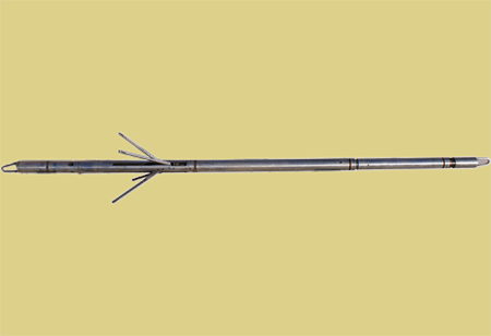 液壓推靠器配接能譜密度與微球復(fù)合探頭,使其貼靠井壁以滿足測(cè)…
